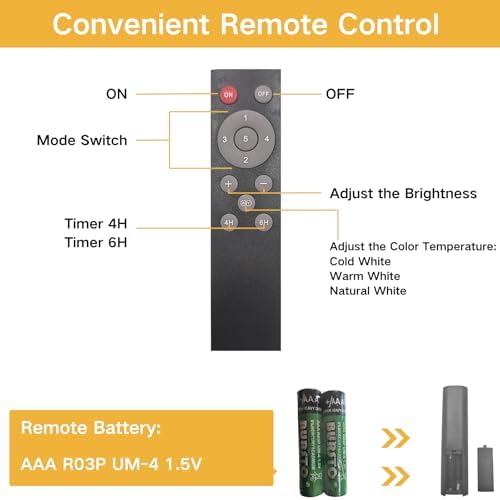 Convenient Remote Control for Instant Lighting Adjustment: This all-in-one remote control delivers effortless lighting management with intuitive controls—letting you power lights on/off, switch between 5 modes, adjust brightness and color temperature, set 4H/6H timers, and enjoy ready-to-use functionality with AAA batteries(1.5V/400mAh). Note: Please turn on the lamp head switch before using the remote control.