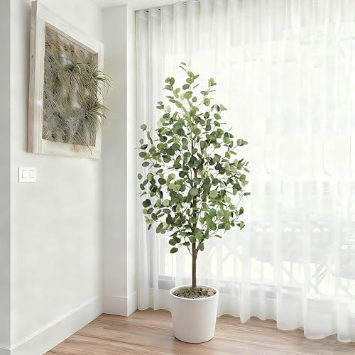 Refresh Your Space with Lifelike Elegance – Bring effortless, modern style to any room with this 5-foot artificial eucalyptus tree. Fake eucalyptus plant features hundreds of realistic, silvery-green leaves for a touch of natural tranquility, all set in a stable, weighted planter(7″H x 7″W) ready to be placed directly into your own decorative pot. The fake tree surface is adorned with black pebbles that complement the tree’s tranquil aesthetic