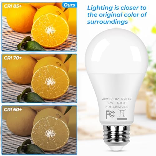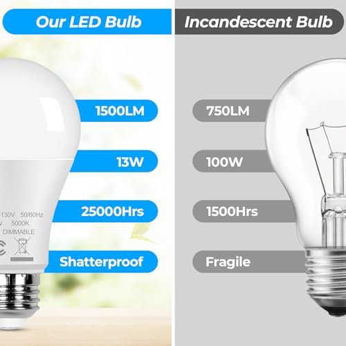 Super Brightness and Energy Saving: 13W A19 LED light bulbs emits 1500Lumens high brightness at 5000K daylight white, creating a clean and energetic atmosphere. The LED bright light bulb is equivalent to a traditional 100W incandescent bulb, greatly save electricity while providing excellent lighting