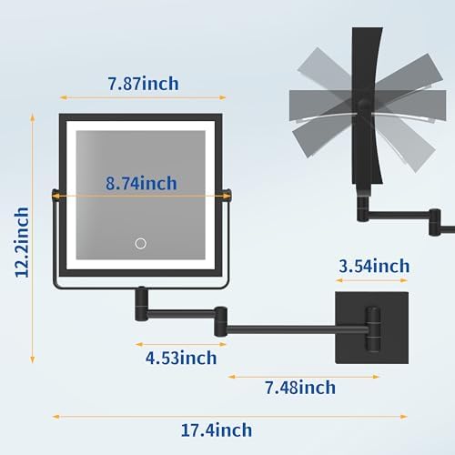 [360°Rotation & Extendable Arm] This wall mounted vanity mirror with retractable arm allows you to adjust the arm to any angle you need. When not in use, you can fold the bathroom vanity mirror back on the wall to save space